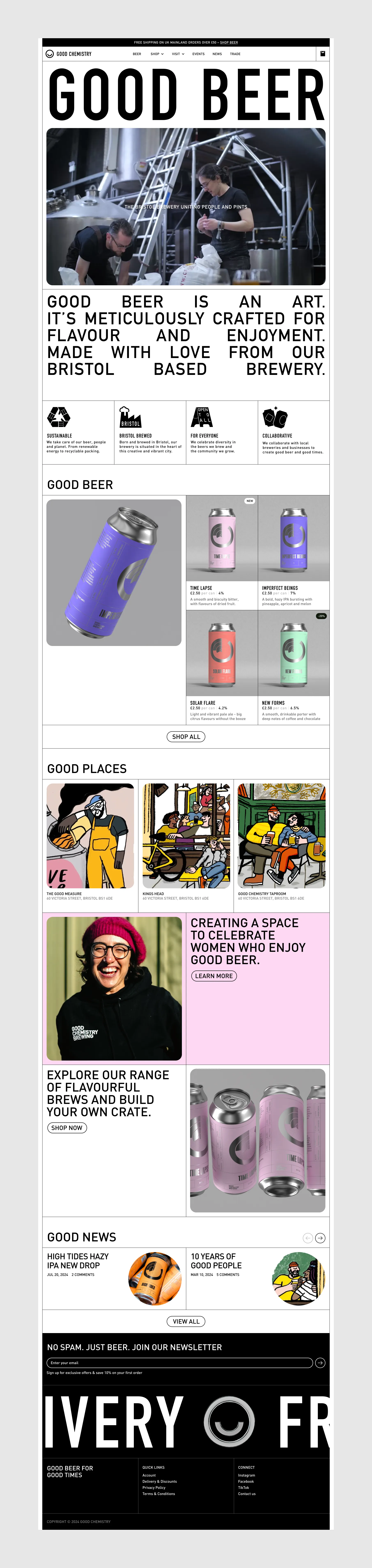 The new site bursts with character—confident typography, vibrant colour, and hand-drawn illustration come together to reflect the brewery’s independent spirit. It’s a bold, expressive design that champions community, celebrates Bristol, and feels unmistakably Good Chemistry.